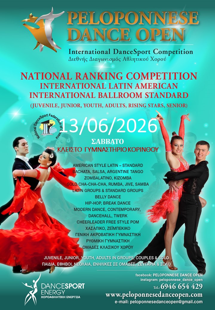 International Latin American, International Ballroom Standard / American Style Latin - Standard /Solo: Cha-cha-cha, Rumba, Jive, Samba / Latin & Standard groups / Argentine Tango, Salsa, Bachata, Kizomba, Zombalatino / Modern Dance, Contemporary, Hip-Hop, Street Dance, Jazz / Hellenic dances: Hasapiko, Zeibekiko / Belly Dance / Dancehall Free Style, Twerk / Acrobatic Gymnastics/ Rhythmics Gymnastics/ Group of Classic Dance / Magioret Pom etc.